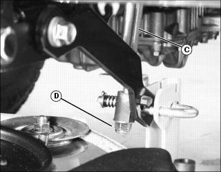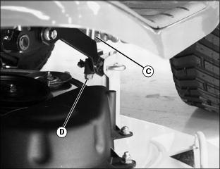 a. Turn nuts (D) on both sides one turn counterclockwise to lower the mower deck.
