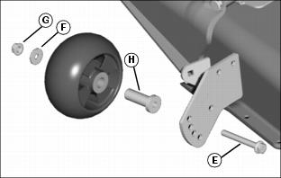 5. Check mower wheel position. Remove bolt (E), washer (F), and nut (G) on all wheels and move wheel with bushing (H) to proper hole.