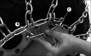 9. Pull the outside rim chain tight and hook the outside lever fastener (B) by running the end through a free link (C).
