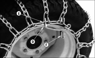 Make sure the chain is centered on the tire with approximately the same number of free rim links (F) on the inside and outside.