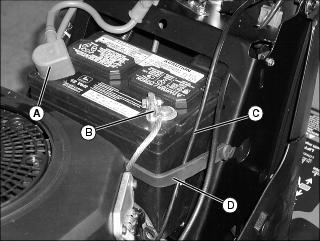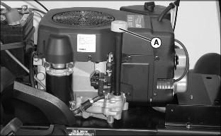 1. Remove and discard the RED positive (+) protective cap from the positive (+) battery terminal. · Battery is fully charged at 12.6 volts. 3. Connect positive (+) battery cable (A) to battery. 4. Connect negative (-) battery cable (B). 5. Apply general purpose grease or silicone spray to terminal to help prevent corrosion. 6. Slide red cover over positive battery cable. NOTE: Make sure the choke cable is routed under black rubber strap when installing. 7. Put choke cable (C) under black rubber strap (D) and intall strap. Check Engine Oil Level1. Remove dipstick (A) and wipe off with a clean cloth. 2. Install dipstick tube. Do not tighten dipstick. Let dipstick threads rest on top of tube, turn cap counterclockwise until it starts to engage threads. 4. Check oil level on dipstick. Oil must be between ADD and FULL marks. 5. If oil level is low, add oil to bring oil level no higher than FULL mark on dipstick. 6. Install and tighten dipstick. Check Tire Pressure2. Check tire pressure with an accurate gauge. 3. Check that tires have equal air pressure. Add or remove air, if necessary. Level Mower DeckLevel mower deck. (See Adjusting Mower Level (Side-to-Side) and Adjusting Mower Level (Front-to-Rear) in the OPERATING section.) |