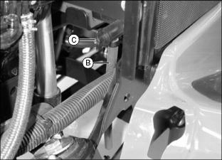 5. Remove cap screw (B) on both sides of fuel filter on right side of machine.