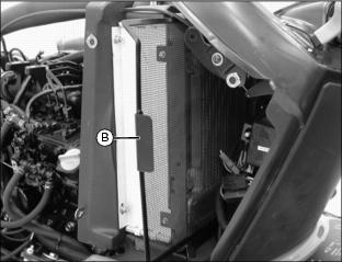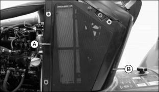 5. Clean rear air intake screen (B) with a brush, cloth or compressed air. Blow compressed air back toward seat.