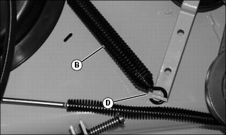 2. Turn adjusting bolt (B) at front of machine frame to adjust lift assist spring: