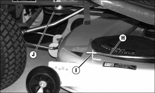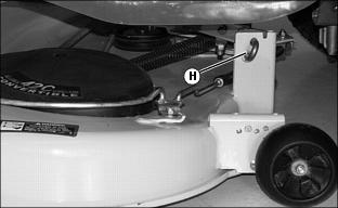 11. Remove drive belt tension rod (H) from bracket (I) and pivot rod as far as possible toward rear wheel to remove all belt tension.