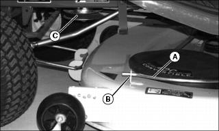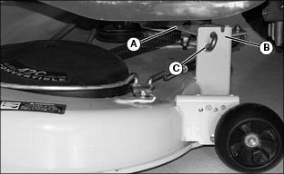 7. Release J-pin (C) to connect mower deck to lift arms. Repeat at other side.