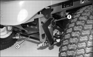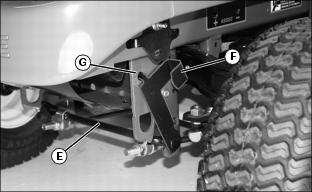 9. Place front lift rod (E) into frame hooks so lever (F) is at left side of machine. Make sure rod is seated in frame hooks.