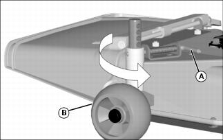 b. Rotate mower wheel (B) 90° and align hole in wheel shaft with pin.