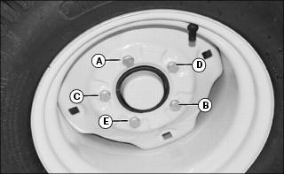Tighten rear wheel bolts evenly in proper sequence: (A), (B), (C), (D), then (E); until snug. Finish tightening to 88 N·m (65 lb-ft).