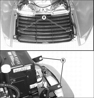 1. Align hood pivot studs (A) with pivot brackets (B) and install hood.