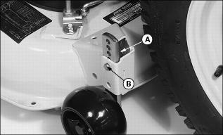 · 48C Mower - Remove spring locking pin (A) and drilled pin (B). Move wheel to operating position. Install pins.