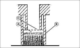 4. Check electrolyte level. Electrolyte level (A) should be 6 mm (1/4 in.) above plates (B) and below filler neck (C).
