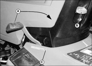 1. Push down slightly on foot pedal (A) and push down on lock lever (B) to unlock latch; pull foot pedal (A) towards rear of machine to lowered position (C), and pull up on lock lever (B) to lock snowthrower into lowered position and remove spring lift tension.