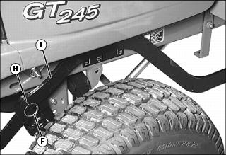 • For all other machines, remove locking ring (F), and slide end of lift bar (I) from lift shaft arm pin (H).