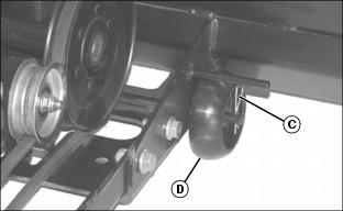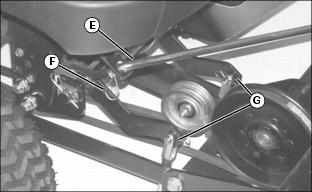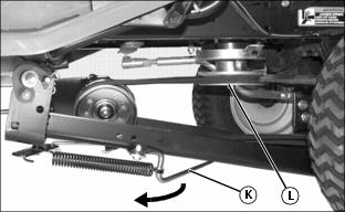 9. Move belt tightener lever (K) out from under frame to unlock and pivot to the rear to loosen belt.