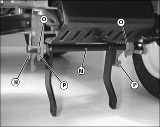 5. Remove spring locking pin (N) and slide “D” shaped bearings (O) and front lift shaft (M) from front tractor brackets (P).