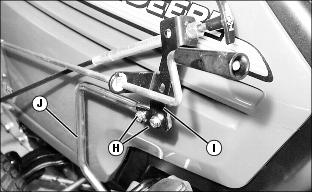 8. Remove nuts (H) and bolts from chute control bracket (I). Remove bracket from support rod (J).