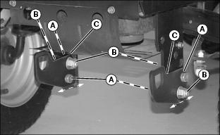 1. Remove four hex head bolts (A) and locknuts (B) and remove front brackets (C) from machine frame.