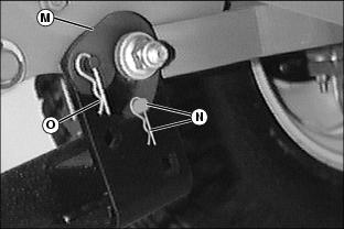 12. Disconnect C-shaped latch (M), one on each side, from draft arm pivot bolt by removing spring locking pin and drilled pin (N).