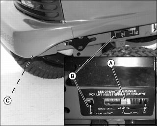 • Be sure lift spring adjustment bar (A) is set to 42 snowthrower setting (B). Adjust tension, by rotating adjusting bolt (C) (in left front frame tunnel) clockwise to increase tension, and counterclockwise to decrease tension.