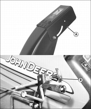 • To lower snowthrower: Push down slightly on foot pedal (A) and push down on lock lever (B) to unlock latch; release lift pedal to lower snowthrower to the ground.