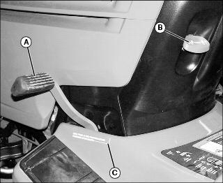 • To raise snowthrower: Push foot pedal (A) all the way down (towards front of machine), and pull up on lock lever (B) to lock into raised position.