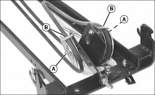 2. Loosen nuts (A) on idlers to loosen guides (B).