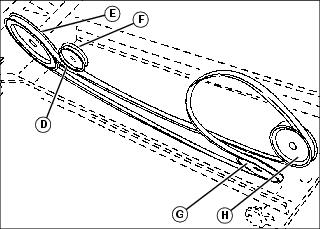V-shaped side of belt goes in groove of idler (G). Flat side of belt goes in groove of idler (H).