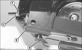 • Belt tension is correct when idler arm (D) is parallel with welded frame (E) as shown.