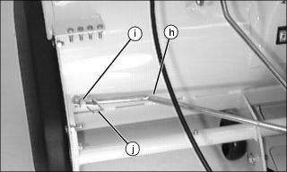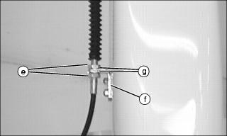17. Loosen nuts (e). Install cable assembly into lower spout bracket (f). Tighten nuts.