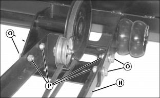 8. Lift up on welded frame (N) near sheaves and fasten to snowthrower frame with four M12x30 hex flange bolts (O) and M12 locknuts (P), (nuts on inside).