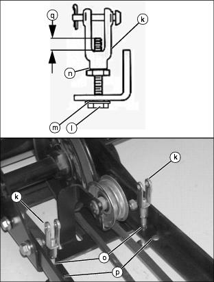 19. Fasten each yoke (k) to hole snowthrower frame with 3/8x2 in. bolt (l), 0.406x1x0.134 in. washer (m) and 3/8 in. jam nut (n).