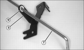 10. Slide chute and spout control bracket (S) onto chute control rod (T). With wider flange facing toward handle, slide snap-in bearing (U) over chute control rod and insert snap-in bearing into bracket.