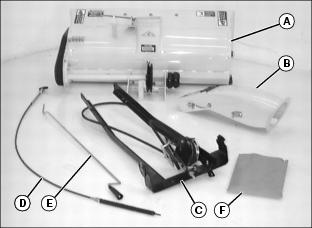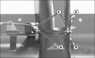 3. Fasten chute to base with three clips (D) and six M5x20 bolts and locknuts (E).