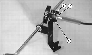 14. Put handle end of cable into top slot of chute and spout control bracket (S) with lock washer and nut (b) against bottom side of bracket.