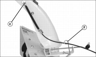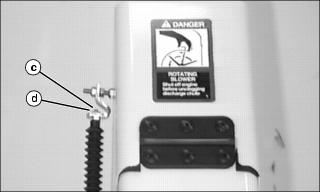 16. Install cable end (c) into upper spout bracket hole and fasten with #10 hex nut (d).