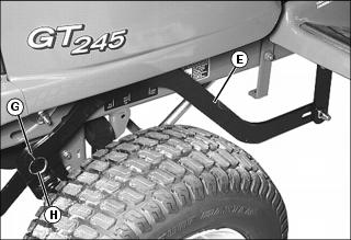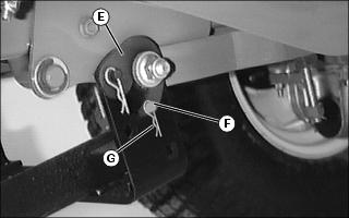 4. Install welded lift arm (E) onto left side of front lift shaft. Fasten with long drilled pin (F) and small quick-release pin (G).