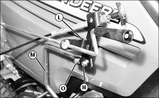 11. Attach 3/8x1 in. hex flange screw (O) and 3/8 in. flange nut in second hole of support rod (M) and hook end of bracket (L) over screw.