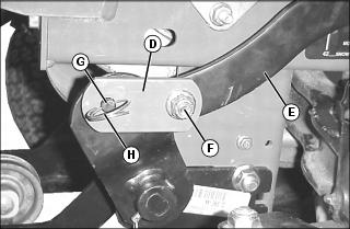 • For all other machines, slide end of lift bar (E) onto end of welded lift shaft arm pin (G). Secure with locking ring (H).