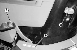 3. Pull lift pedal (A) back by hand to lower lift assembly to the lower/down position (B). Pull lock lever (C) up to lock lift assembly in the lowered position.