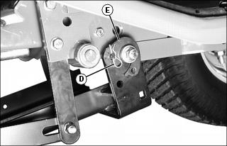• Remove small spring locking pin (D) and C-shaped latch (E), from left side only, to allow easy installation of blade frame.