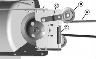 Proper tension is maintained on the drive belt (A) by the tensioning spring (B), connected to the tensioning arm (C).