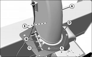 1. Install chute assembly (A) on chute base, with teeth on chute aligned with spiral rod (B) on chute rotation rod (C). Secure chute with retaining bracket (D), secured to chute base with four M8x20 self-tapping screws (E), and four spacers between chute and chute base. Tighten hardware.