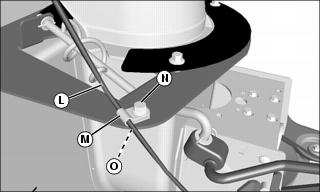 4. Secure spout cable (L) to the left rear mounting hole in the chute base, using clamp (M), M6x16 flange head bolt (N), and M6 nut (O). Do not tighten completely. Cable should be able to slide in clamp, and clamp should be able to pivot freely.