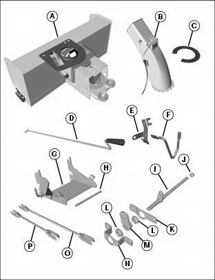 6. Put handle end of cable into top slot of chute and spout bracket (G) with lock washer and nut (Q) against bottom side of bracket.
