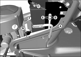 3. Align the two mounting holes in the straight end of the bracket with two square mounting holes in the left side console support plate (C). Install bracket by inserting two M8x20 carriage bolts (D) through the console support plate and the bracket, and securing with two M8 nuts (E). Tighten hardware.