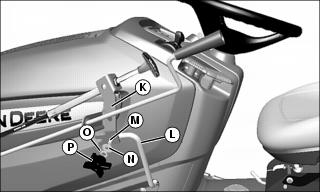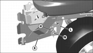 6. Align hole in front attachment hitch (K) with hole in front draft assembly (L) and install front draft pin (M). Secure with large M4.5 spring locking pin (N).