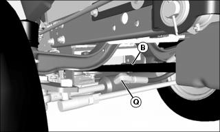 9. Check for interference between drive belt (B) and the left side fitting (Q) on the machine steering cylinder. If necessary, rotate fitting down approximately ten degrees to eliminate interference and premature belt wear.