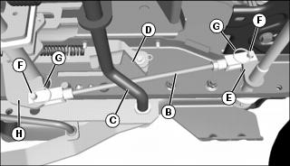 3. Raise shorter inner lift rod (B) into position between brake rod (C) and bracket (D), and install front yoke of lift rod to ear (E) of rockshaft. Secure with M10x28 drilled pin (F), installed from outside in, and locking ring (G).