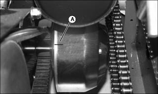 6. Place straight edge across top of sprockets and measure distance (sag) from bottom of straight edge to top of chain. Slack should be 13 to 25 mm (0.5 to 1.0 in.).